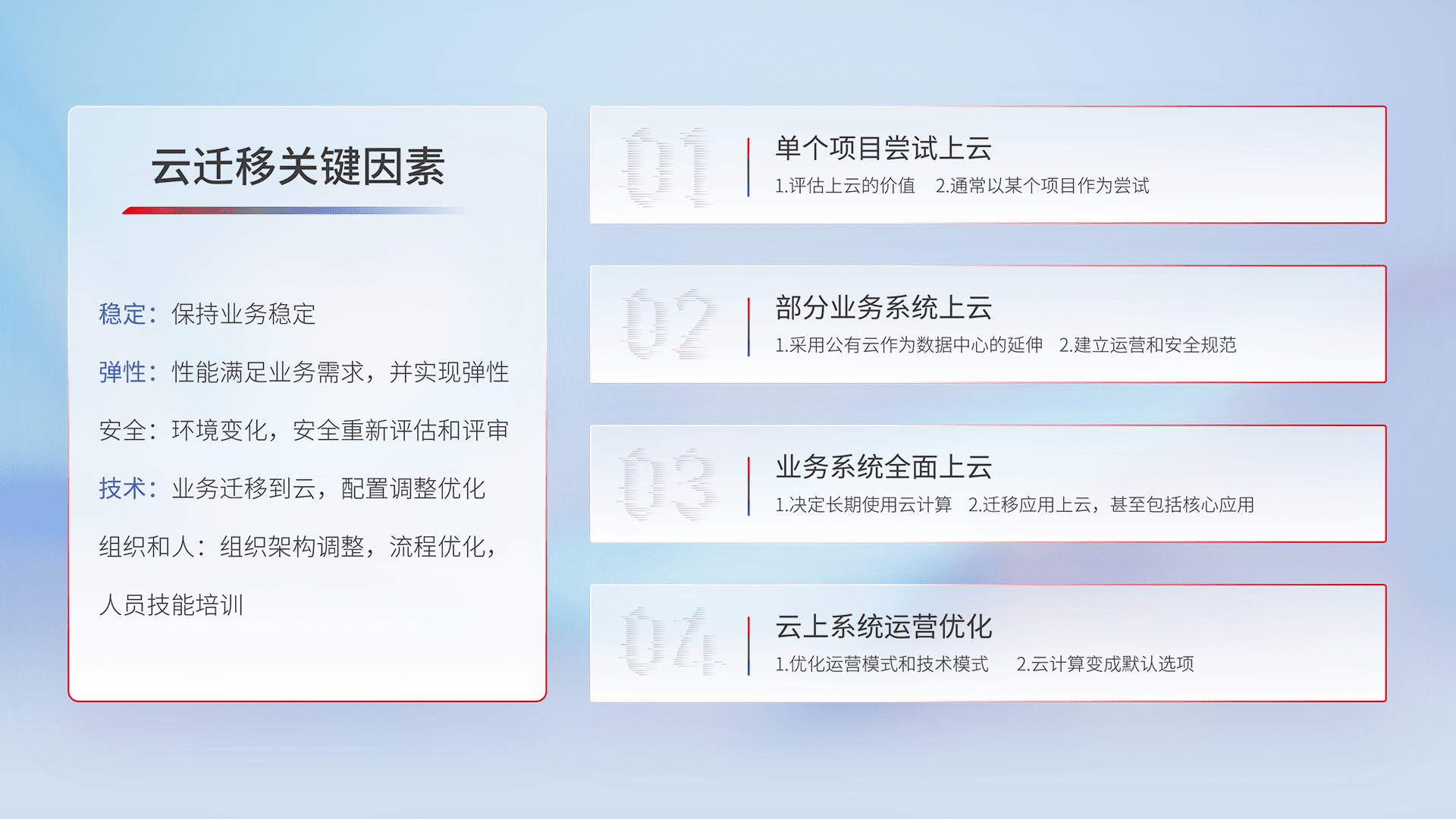 结合实际业务,,从规划设计、、、、云平台选型、、、、云原生改造、、、、数据迁移、、集成交付,,,迁移全过程为客户识别最佳上云路径,,,,做好风险识别管理,,,设计网络架构、、、、身份权限、、、安全审计合规、、操作审计、、、日志审计、、、、监控告警策略、、、多站点容灾设计等,,对云上基础设施进行整体规划,,,,提升IT治理水平,,,以满足弹性、、、、高可用、、、高性能的需求。。。。