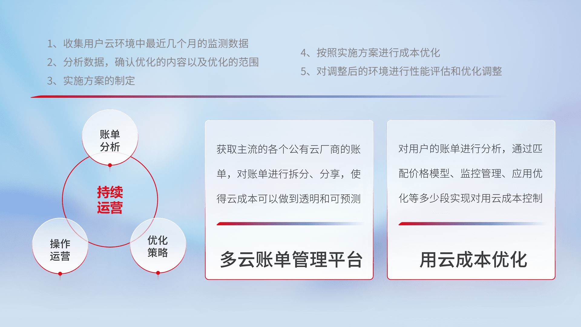 通过多云纳管,,,,以统一的资源数据模型把客户的云资源进行抽象和封装,,进而实现对多云资源的统一操作,,,保障云资源管理的可靠性、、稳定性与可用性。。量身定制化运维内容,,配置、、、、开发运维、、、、补丁管理、、、、备份、、监控、、、认证和访问管理、、、审计和日常巡检等,,,,保障在用云过程中的可靠度,,,,稳定度以及高可用率。。